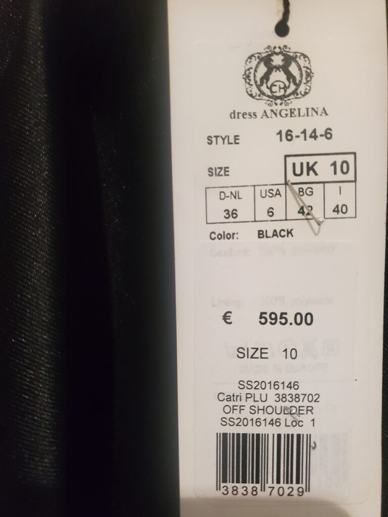 Caitriona Hanley Couture, black luxurious material, Size 10, strapless with large frill from bust to almost waist, good length, and back zip opening, never worn, tag still attached